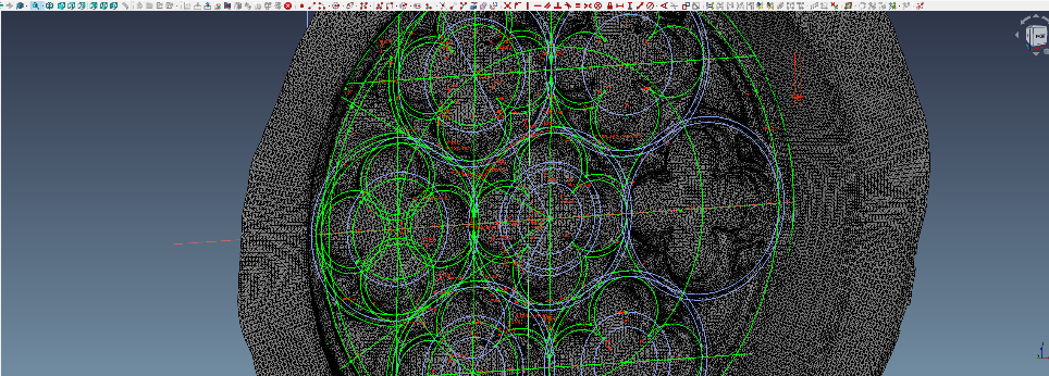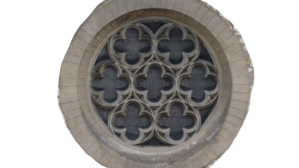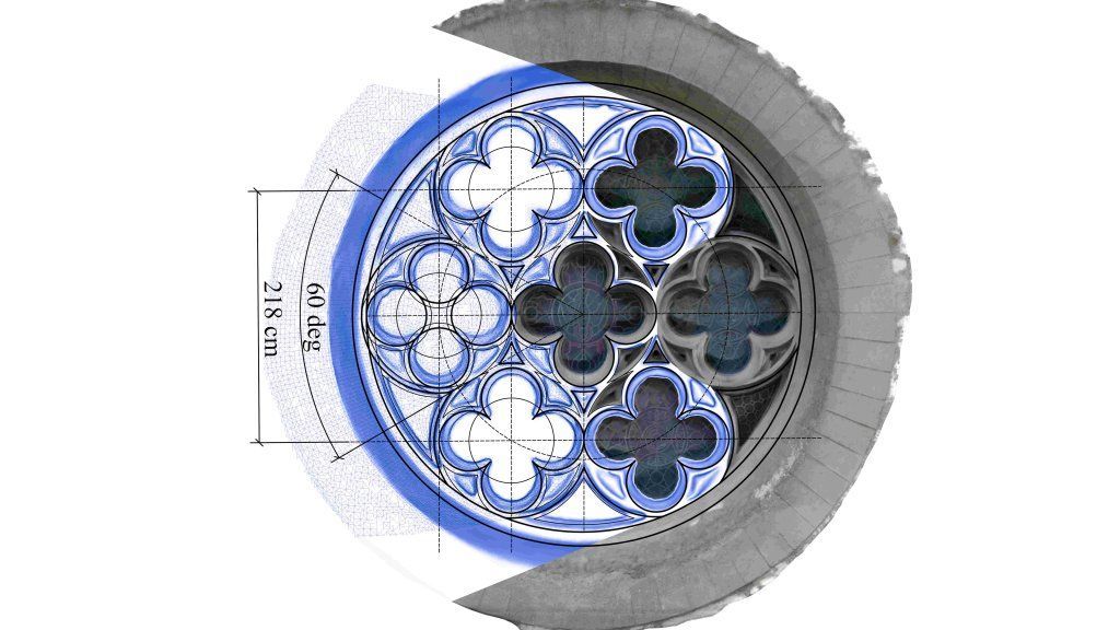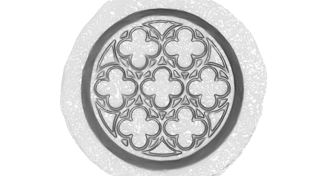 Dieses Rosettenfenster wurde zuerst aus dem hochauflösenden Modell extrahiert und dann in ein ein regelmässiges aus Quadraten bestehendes Gitternetz konvertiert. Dieses bietet eine einfachere Struktur im CAD wo einzelne Eckpunkte oder Gitterlinien als Fangpunkte für die Rekonstruktion verwendet werden können. Auf dieser Grundlage können nun Skizzen direkt im Modell erstellt werden und in neue regelmässige 3d Modelle umgewandelt oder als Konstruktionspläne exportiert werden.