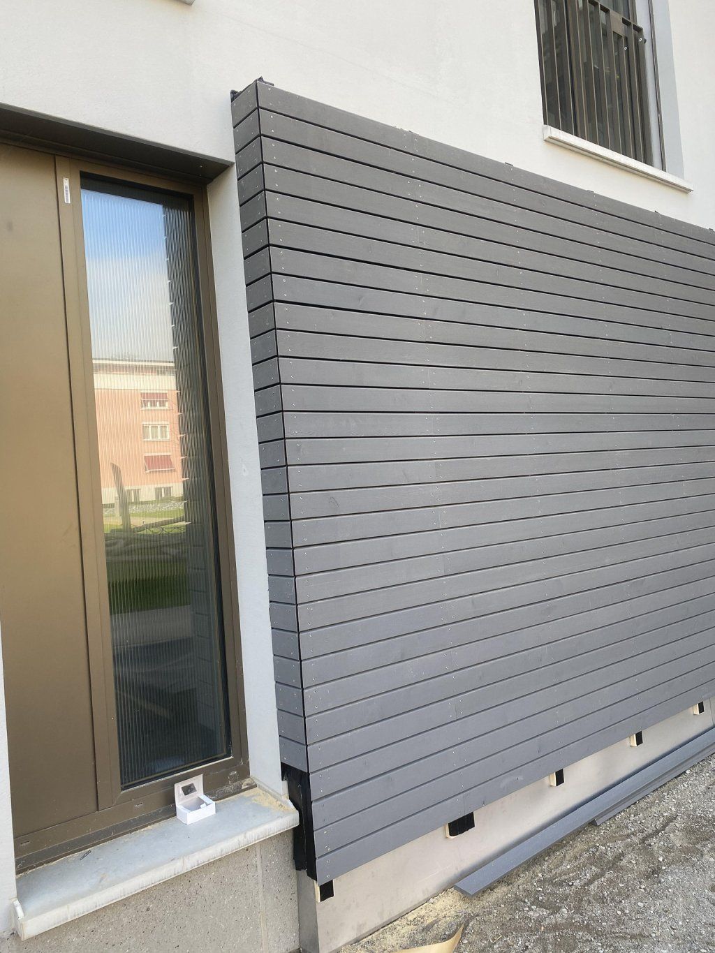 Balkonverkleidungen auf Geerung an einer grossen Überbauung.