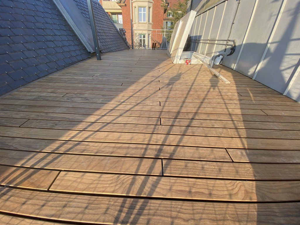 Wild gestossener Dachterassenbelag aus Teak. gewünscht waren kurze Längen, verlegt auf einer Unterkonstruktion aus Aluminiumprofilen in Anpassung auf die Neigung des darunter liegendem Blechdachs.
